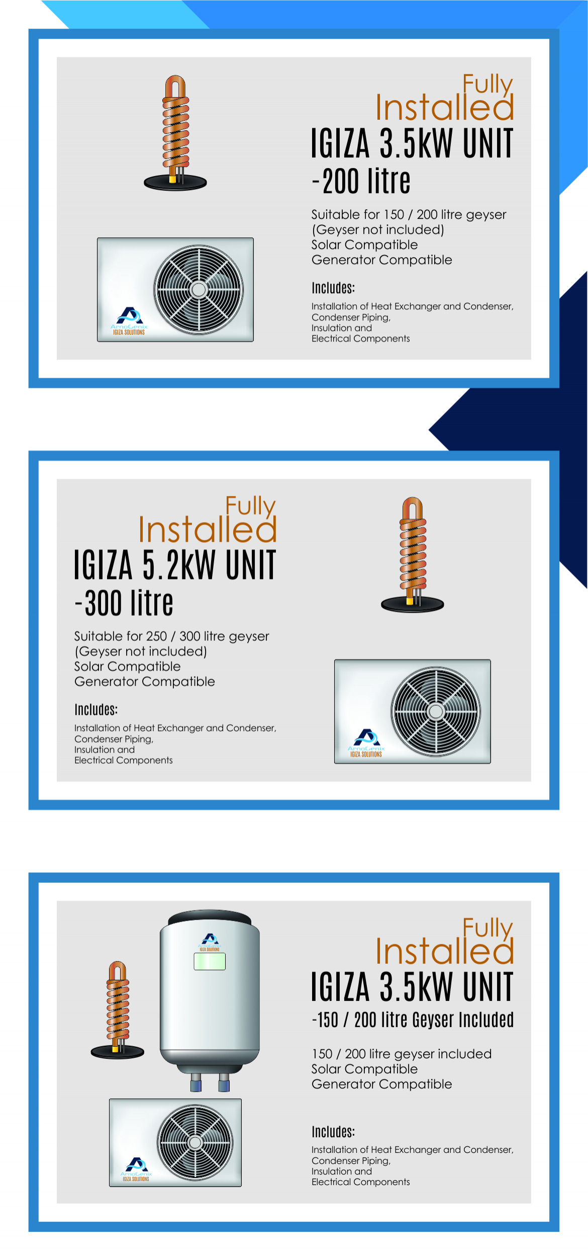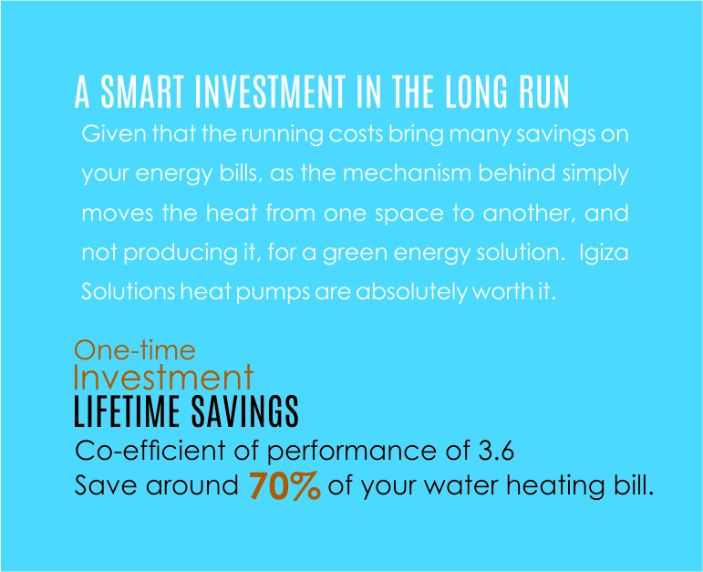 When it comes down to settling on a water geyser, important deciding factors are cost and energy efficiency. Igiza Solutions are committed to provide a more energy-efficient solution to bring down your electricity bills. Our heat pump products let you save on energy by not heating the water directly. Heat is generated by moving it from one place to another.